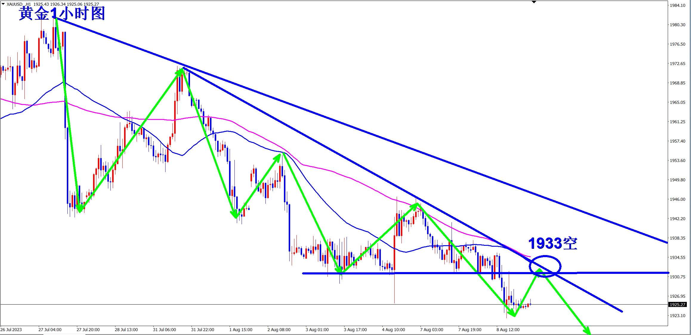 黄金当前继续延续下跌,顺势干空!早盘依托1933的压力继续干空!顺势轻飘飘,逆势乱糟糟!跟上市场的节奏,盈利就是顺理成章! 黄金明显的下跌趋势,眼睛都看得见,无需多言!有很多的人希望抄底做多,贼心不死,