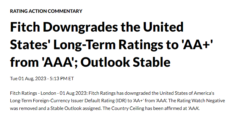 惠誉将美国长期外币债务评级从AAA下调至AA+,展望从负面转为稳定,为1994年首次发布美国信用评级以来第一次对该国的评级下调。耶伦对此强烈不同意。美国三大股指期货应声下挫,美债期货走高,美元指数走弱