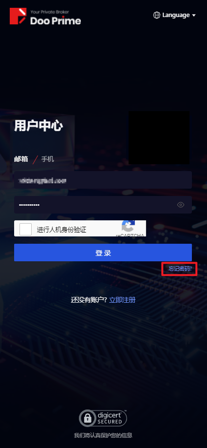 忘记DooPrime德璞资本用户中心的真实账户密码怎么办? 之前有介绍过忘记模似用户的登录密码找找回办法,如果你是真实用户密码忘记了怎么找回呢,具体看下面步骤。 1.在登录页面,点击「忘记密码」