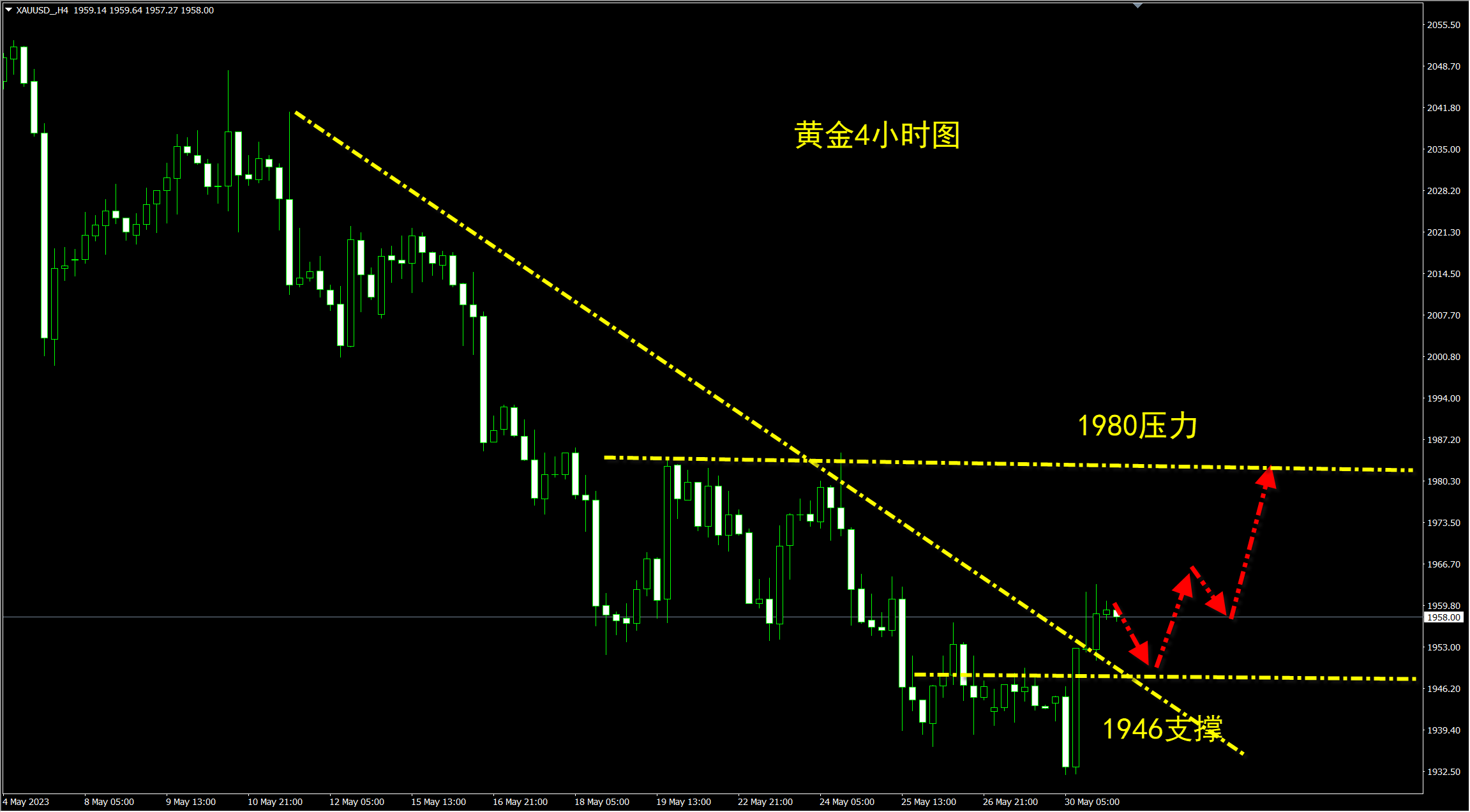 黄金昨日探底后快速大幅拉升,突破1950压力,下跌趋势转变,反弹上涨开启!早盘回落依托1946的支撑低多继续看涨,接下来的目标1980! 黄金此前杜康已经提示,4小时上经过了完整的五浪下跌结构,从2080位置开始的