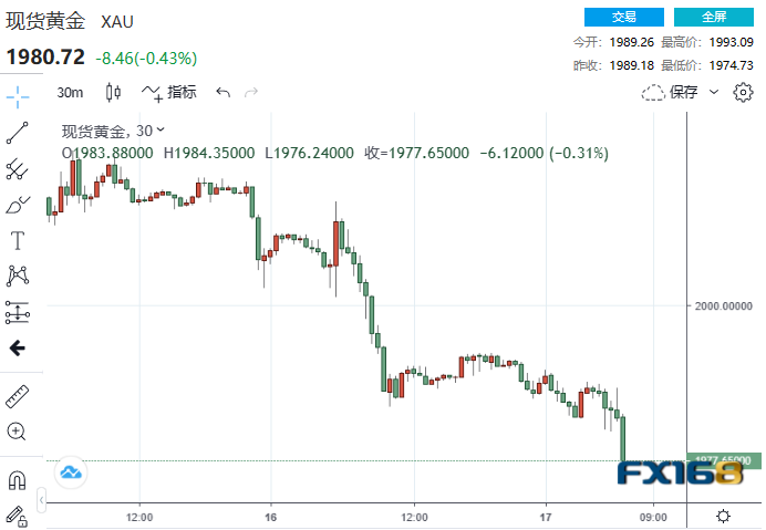 金价周三(5月17日)收于3月底以来的最低水平,此前一天,金价在两周多以来首次收于2000美元以下,金价近期的涨势继续瓦解。 美市尾盘,现货黄金收报1981.65美元/盎司,下跌7.53美元或0.38%,盘中最高触及1993.