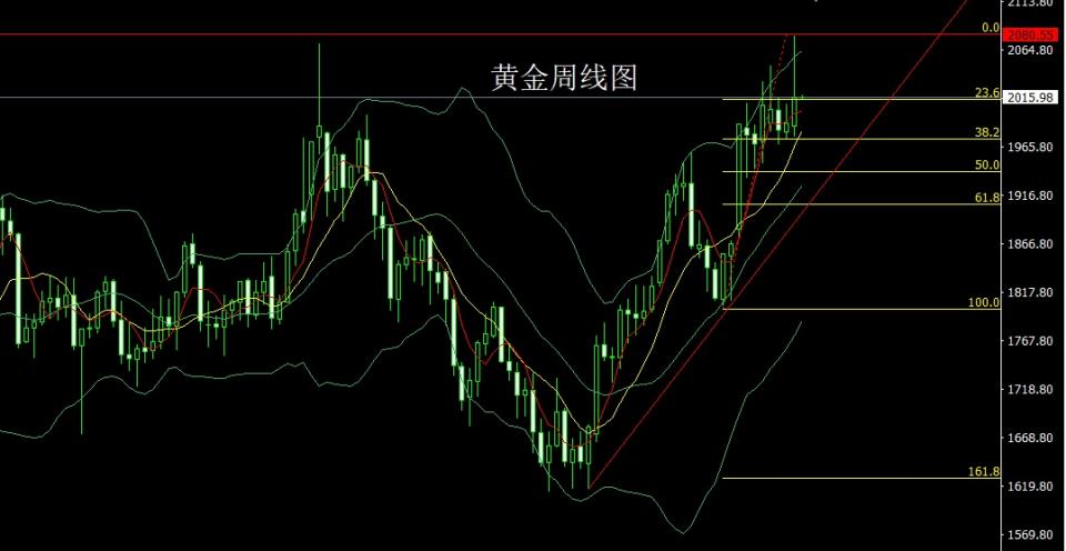 上周黄金市场周初开盘在1990.7的位置后行情先回落,周线最低给到了1976.5的位置后行情强势拉升,到周四行情早盘受到避险消息影响直接拉升给出新的历史高点2079.8的位置后行情出现获利了结过程,快速回落,周五行