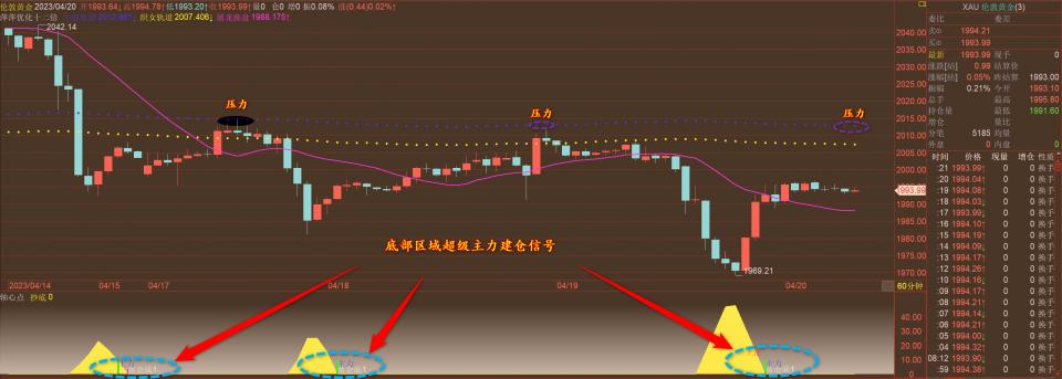 DooPrime德璞2023年04月20日黄金交易策略 通过对黄金小时图解析得知,昨日行情先跌后涨上方受制于双轨道的压制盘中冲高回落到达下方1969一线再次出现了超级主力抄底信号符合我们前期的抄底预期空间(1960