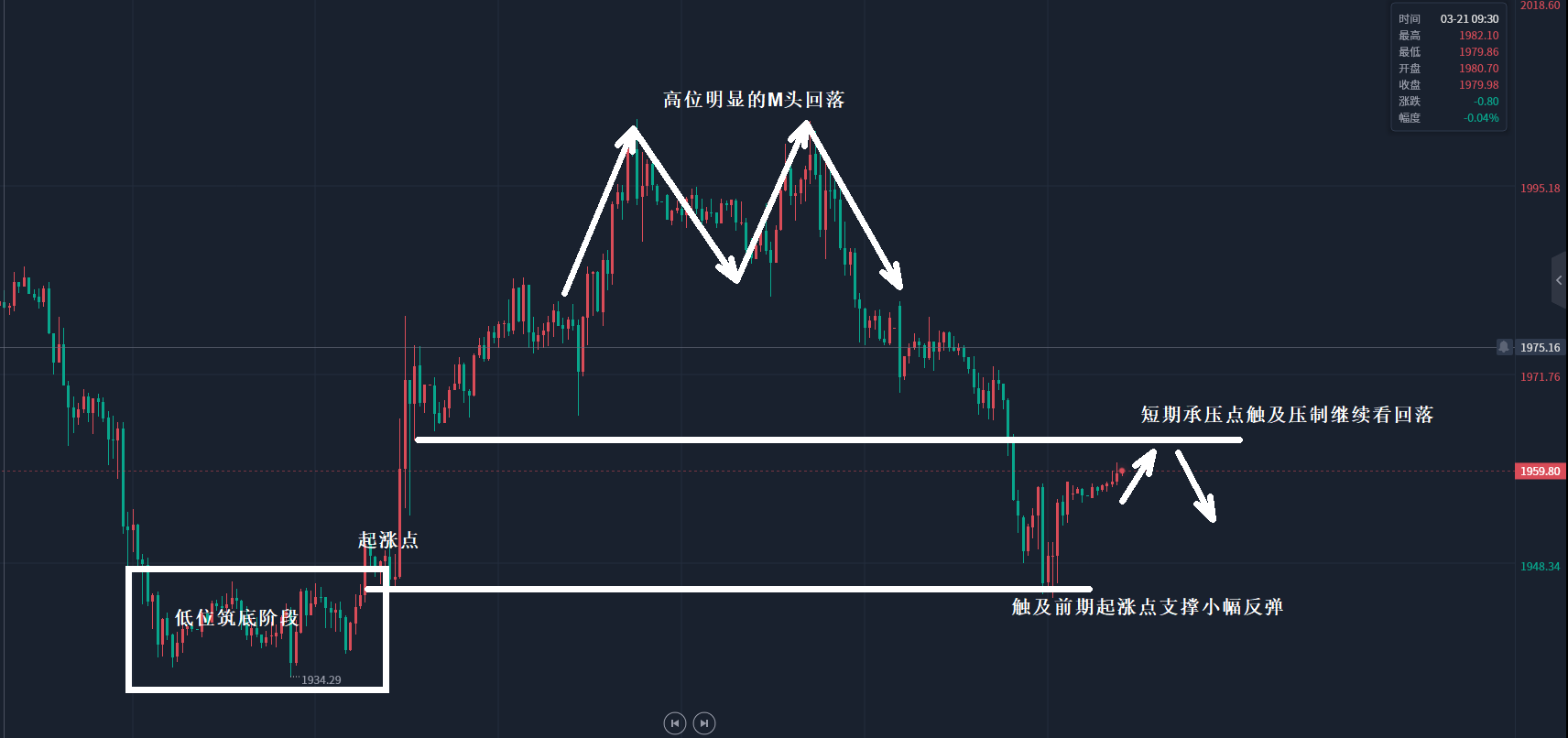 首先高点呈现较为明显的M头回落,短期承压回落,高位连续性的触及均未能延续,成为短期的高位承压带。 其次反弹一波流结束之后,必将成为回撤的有效参考因素,周一反弹无果,延续了周五的下跌走势,在白盘震荡