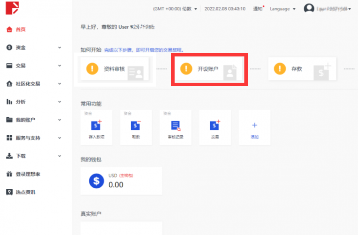 DooPrime德璞资本怎么设置mt4/mt5交易帐户 开设交易账号 一、登录您的会员中心,点击左边的“首页”,然后找到右边的“开设帐户” 二、请选择「交易