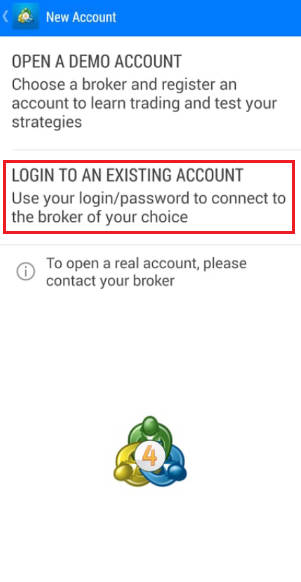 安卓手机安装好MetaTrader4/5怎么登录dooprime帐户 登陆交易账户 安装好MetaTrader4手机版之后点开软件进入到登陆页面,如果已经开立真实账户,请选择「登陆一个已有账户」。