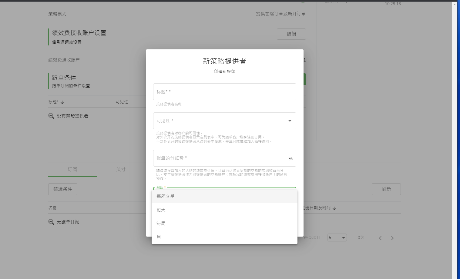 DooPrime德璞资本CopyTrading跟单系统常见问题 信号源可选择的分润周期有哪些?最高分润比例是多少? 信号源在创建「跟单条件」时,可以选择每笔、每日、每周或每月收取绩效费。 信号源