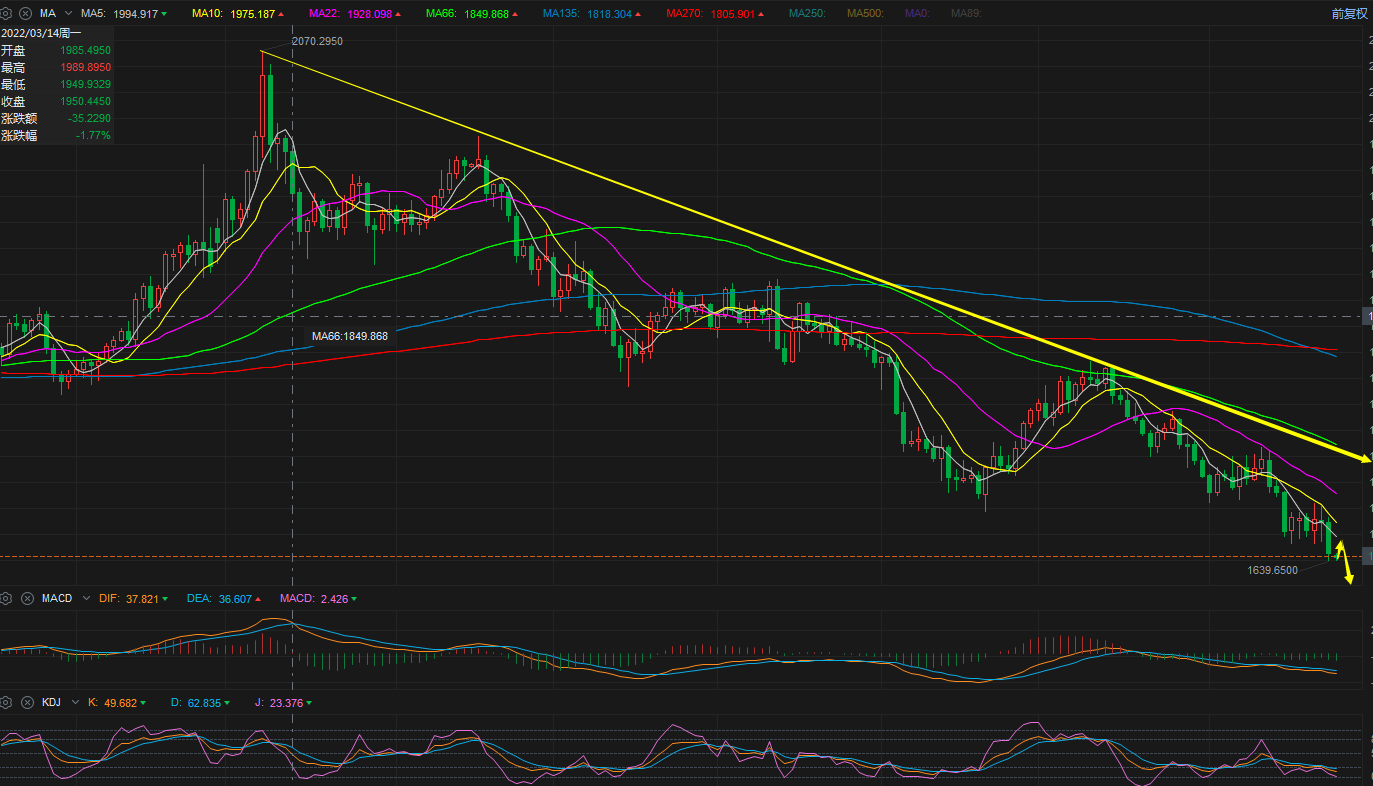 周五受美指的强势走高,黄金及非美原油全部出现大跌,美指一度拉升到113上方,而黄金尾盘最低下探到1638一线,收盘以一根中阴线报收于1645.符合预期。 从盘面来看,周图均线系统空头排列,连续四周压制于十周均