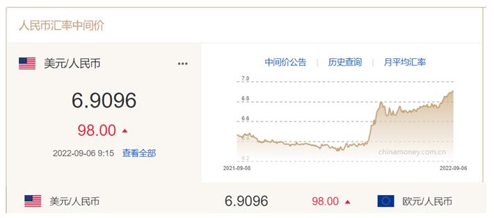 欧元/美元 欧元兑美元一度跌破0.99,创2002年12月来新低。9月8日(本周四),欧洲央行将迎来议息会议,市场普遍预期,欧洲央行至少加息50个基点,甚至可能加息75个基点。但是,欧元区经济衰退的概率飙