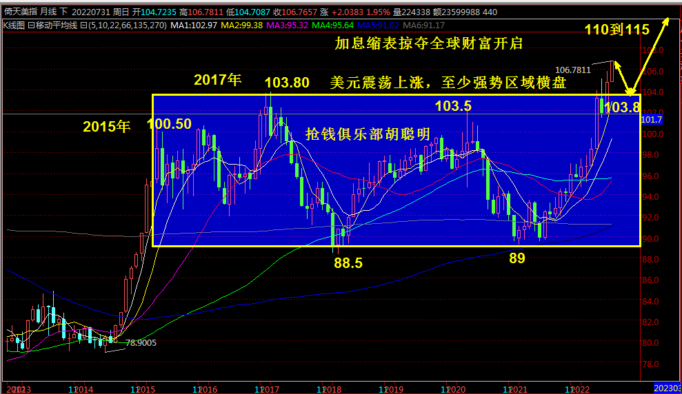 DooPrime8月23日外汇市场分析 USDX 预计年内美元指数构造未来8年以上的超级大顶部,暂时预计顶部位置113/115 长线实盘操作者可以在1.0000以下直到0.9000分批逢低买入欧元,越跌越买 杠杆交易要小心下半