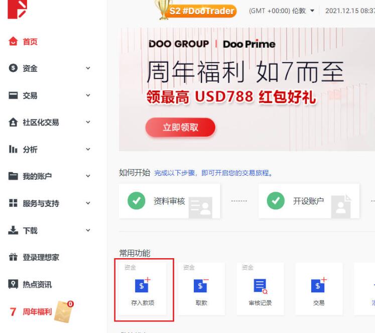 Dooprime德璞资本如何存款入金? 1.进入DooPrime用户中心 登录进入DooPrime用户中心首页后,在「常用功能」一栏点击「存入款项」。 2.选择存款方式 3.选择支付货币及存款渠道 4.选择账户,