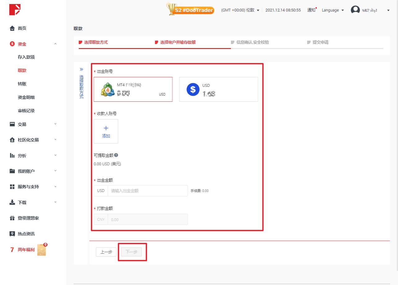 选择取款账号和收款人账号,填写取款金额(美金),完成后点击「下一步」。