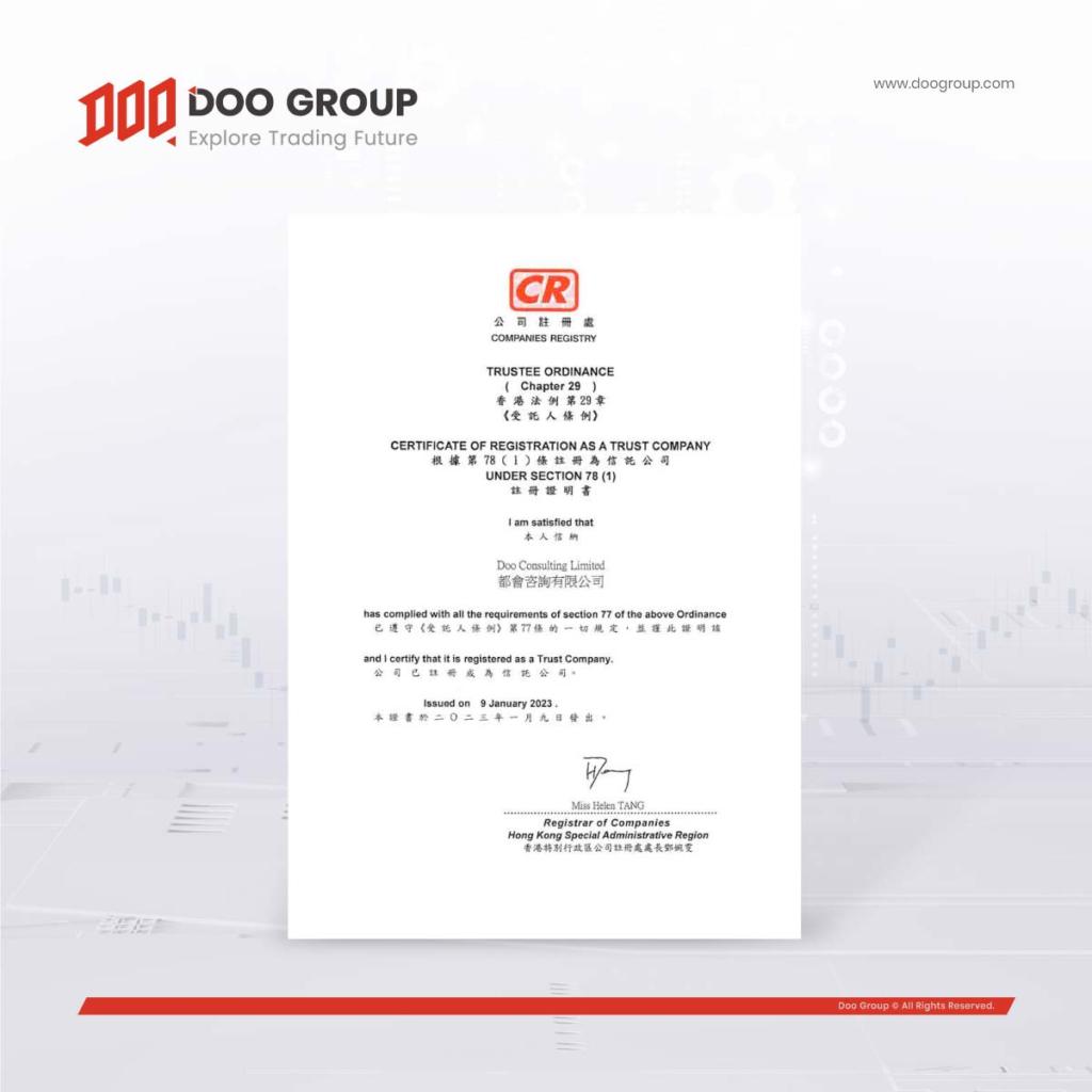 Doo Group 旗下品牌 Doo Wealth 的公司 Doo Consulting Limited(“Doo Consulting”)成功向香港公司注册处申请,根据《受托人条例》(香港法例第 29 章)注册成为信托公司,这是集团发展历程的重要里程碑。公司注册处是香港财经事务及库务局辖下的部门。