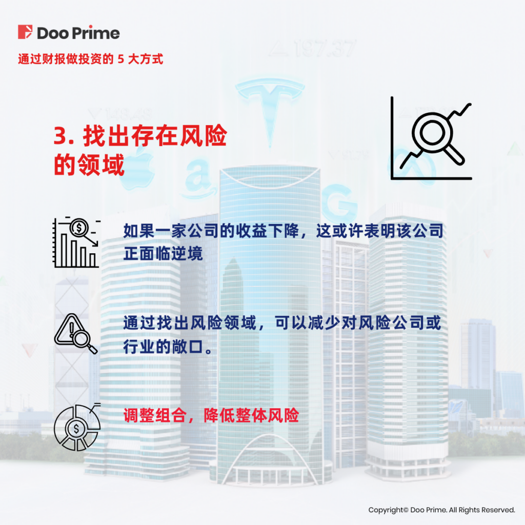 例如,如果一家公司的收益下降,这或许表明该公司正面临逆境,或者增长前景逐渐疲软。通过找出风险领域,投资者可以调整自己的投资组合,从而减少对风险公司或行业的敞口,最终降低整体组合的风险。