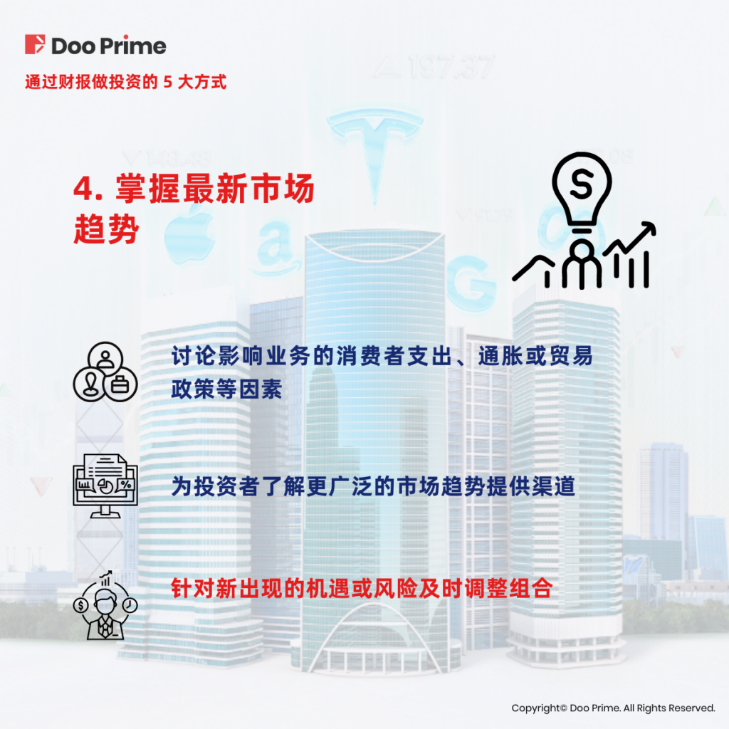 企业报表为投资者了解更广泛的市场趋势提供了宝贵的了解渠道,因为公司经常会在财报上讨论影响其业务的消费者支出、通胀或贸易政策等因素。通过了解最新趋势,投资者可以调整自己的投资组合,从而抓住新风口或降低潜在风险。