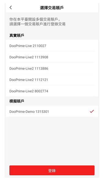 之后因应个人需求选择您已开设的真实账户或模拟账户,然后点击下一步即可以 Doo Prime InTrade 进行交易。