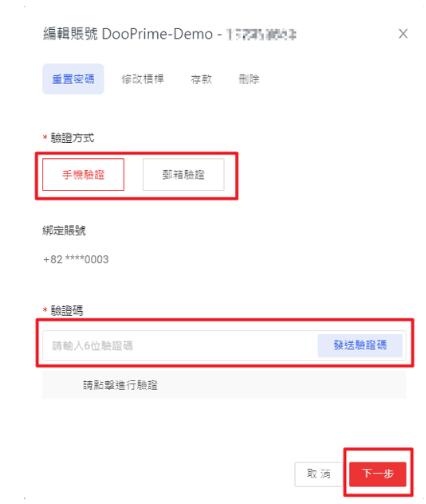 2. 点选「重置密码」,可选择「手机验证」或「邮箱验证」,点击验证,收到验证码后按「下一步」。