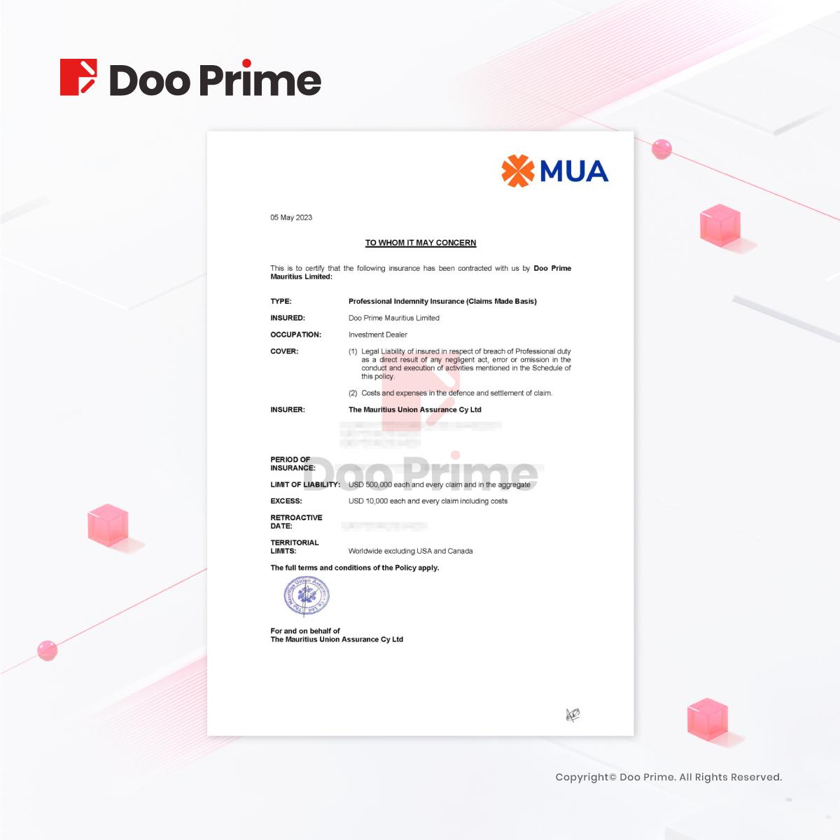 本次续签的专业责任赔偿保险(PII)分别由劳合社(Lloyd’s)特定承保人和毛里求斯联盟集团(Mauritius Union Assurance Company Limited (“MUA”))承保,始终保护 Doo Prime 客户的资金安全。