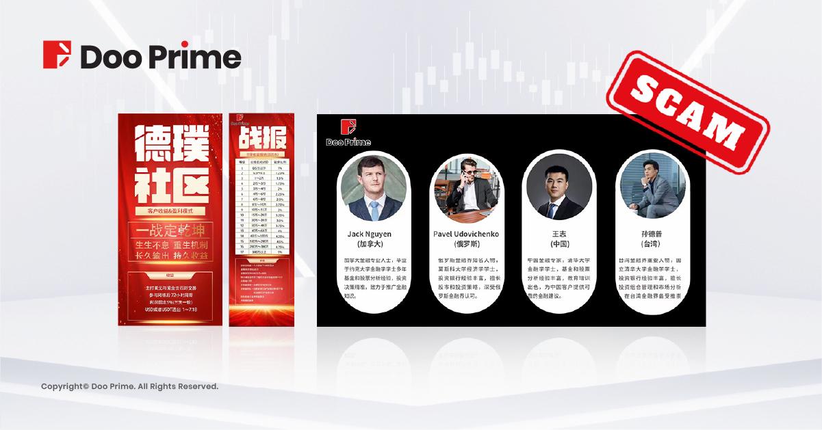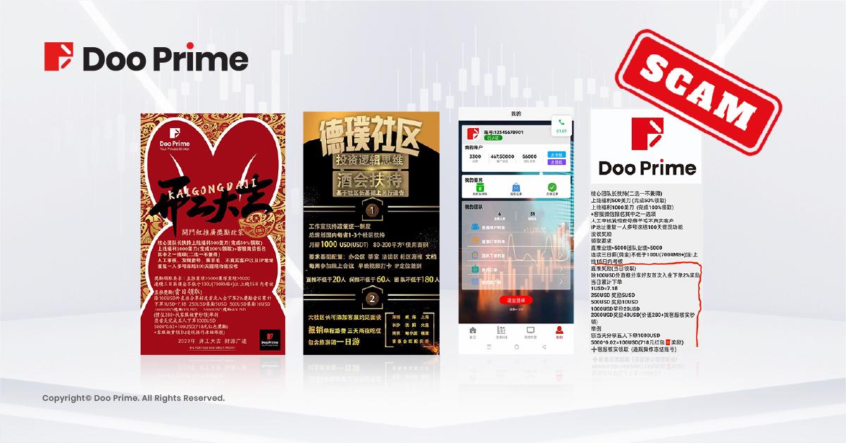 与此同时,经核查,“德璞社区”盗用 Doo Prime 商标并冒用 Doo Prime 名义在网络上开展一系列虚假宣传活动,试图混淆视听欺诈客户,诱导客户进行投资。此种行为不仅严重侵害了我司权益,同时给客户投资交易带来风险,请客户注意甄别,谨防上当受骗。