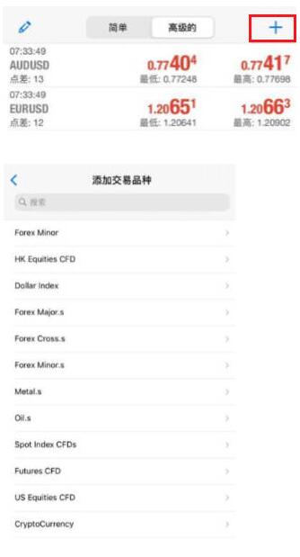 登录交易账号之后会跳转至交易品种快捷列表,用户可以自由选择显示的交易品种以便在交易过程中查看。