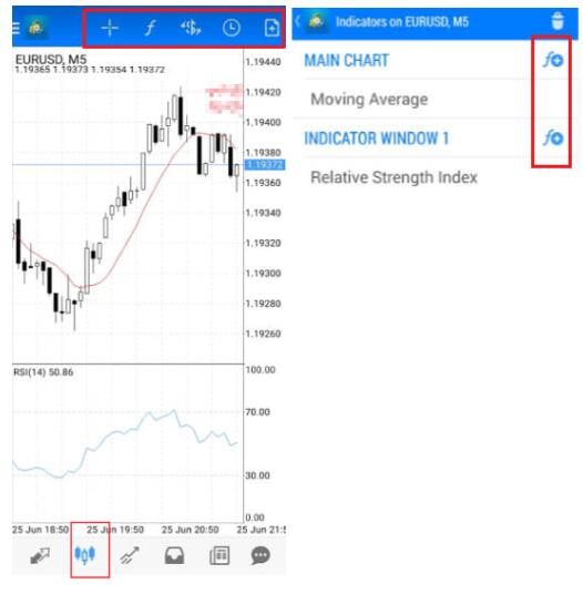 选择相应品种(此处以欧元、美元为例),点击 K 线图按钮,选择「f」指标按钮。