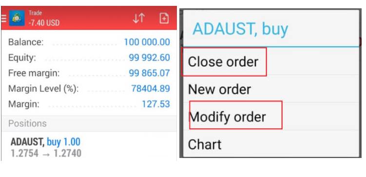 对现有持仓订单设置止盈止损,长按该订单,选择修改订单,输入止盈/止损点位即可。参考第 5 步骤。