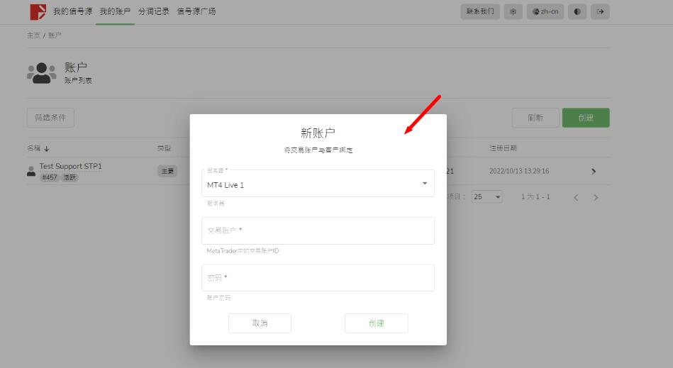 3.新的交易账户可以用来发布新的信号源,也可以选择成为跟随者,或者用来接收绩效费。