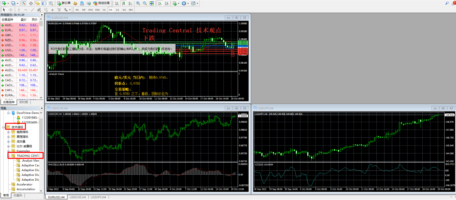 6.重启您的 MT4 客户端后,请在左侧导航栏点击「技术指标」后选择「Trading Central」然后浏览全部指标
