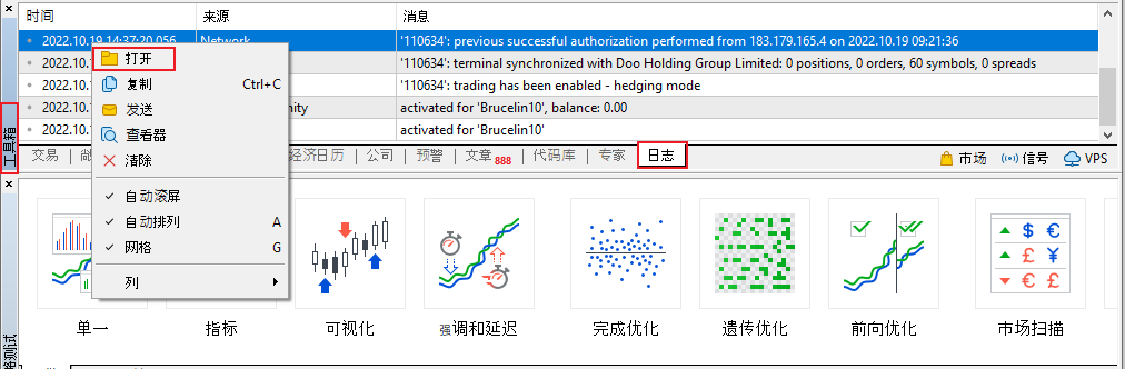 请您登录MT4 后在底部菜单栏右键点击「日志」后选择「打开」,您便可以自行保存选中的交易日志