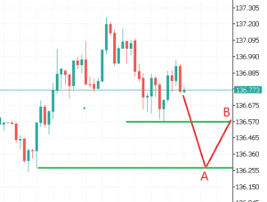 c) 当USDJPY的价格向下触碰A线时,激活在B线的Sell Limit 订单,当价格从A线反弹到B线时, 按照B线的价格成交一个Sell 订单;
