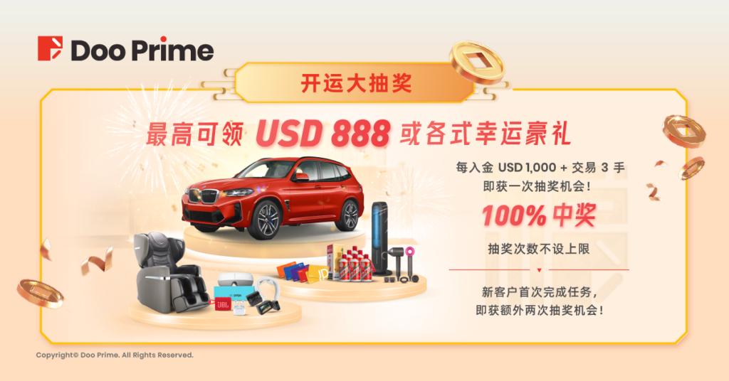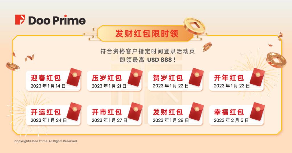 除了新春大抽奖活动外, Doo Prime 将在一个月内为全球客户派发 8 次限时发财红包,只要您曾在Doo Prime 入金 100 USD + 交易 1 手,就可以领取我们的发财红包!单次可领最高 USD 888 ,希望这 8 次发财红包助您新的一年一路发发发!