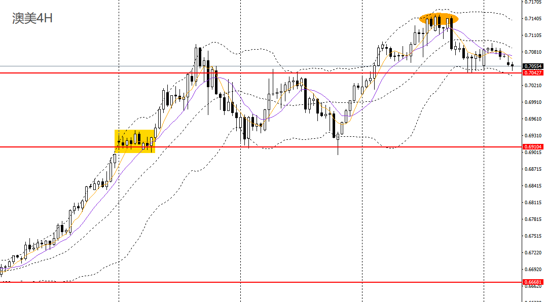 澳美周一微幅走高,今日亚盘拐头下行,4小时头肩顶确立,大概率将彻底下破0.7040一线支撑,空单仍可持有,后市看继续看空至0.70。