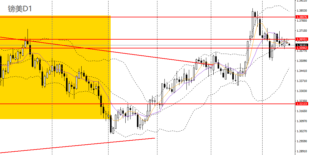 镑美昨日收十字星,4小时未能有效升破前高,1.3650附近仍面临强压,短线预计将重归震荡走势,可保持观望。