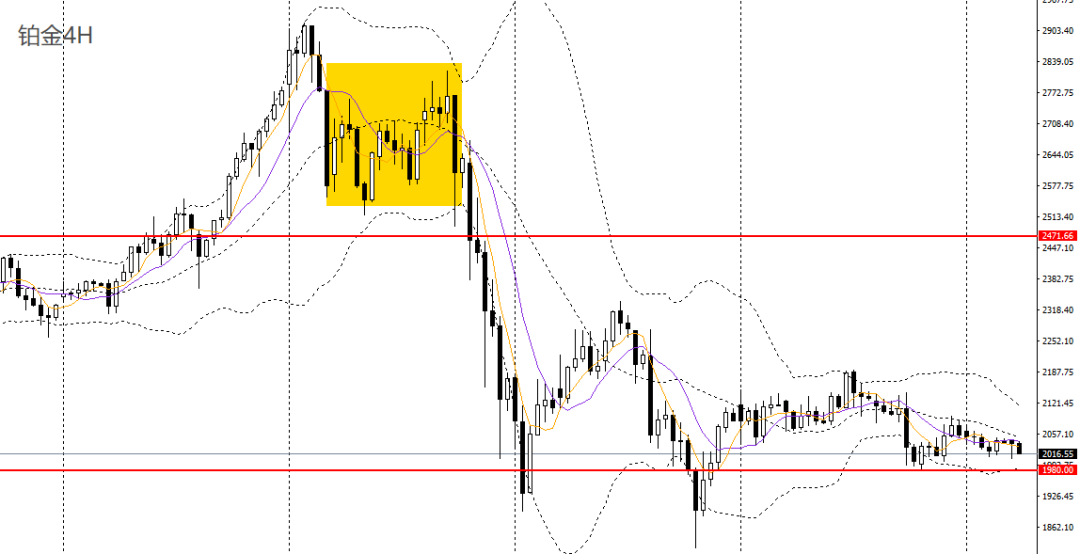 铂金昨日收小阴线,日线RSI仍位于50下方,4小时重新回踩2000关口支撑,短线趋势再度转弱,下方首先关注1980一线支撑,如彻底失守,可看空至1880-1900。
