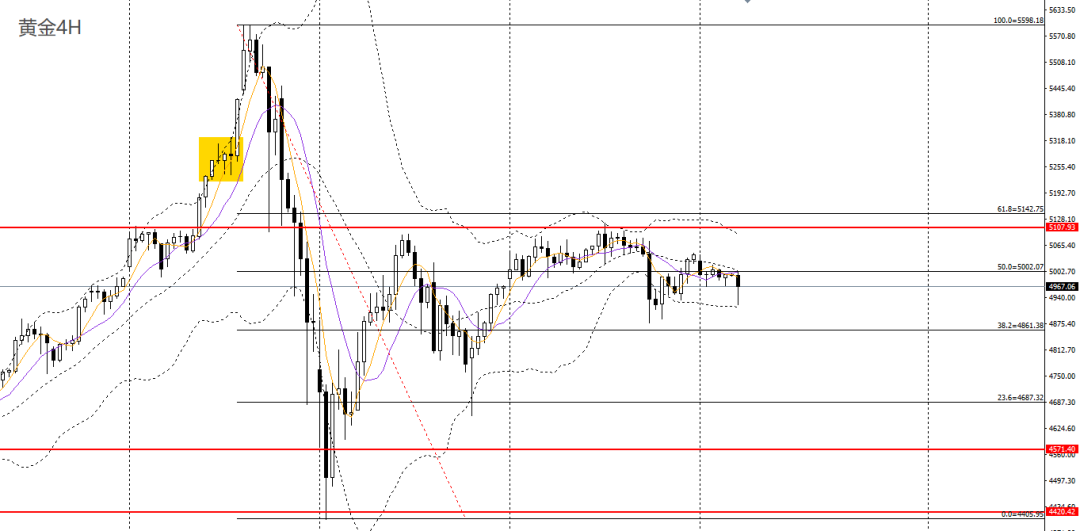 黄金昨日收小阴线,4小时重新承压于5000下方,短线预计将维持4900-5100区间震荡格局,可保持观望。黄金/人民币可继续观望。