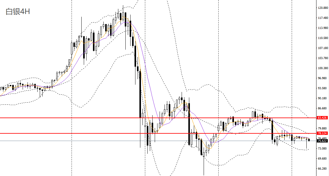 白银收小阴线,承压于5日、10日均线压制,4小时78一线仍面临强压,后市大概率将继续震荡走低,可继续看空至71.50。