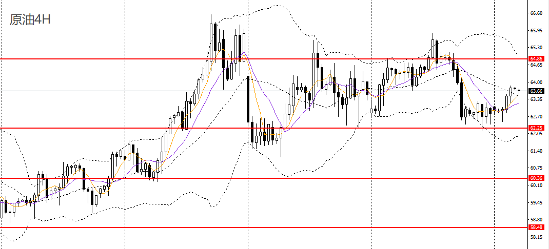 美原油周一探底回升,5日、10日均线交错粘合,日线RSI位于50左右,4小时呈圆弧底,62一线为下方关键支撑,短线多单可继续持有,如彻底站上64,可上看至65附近。