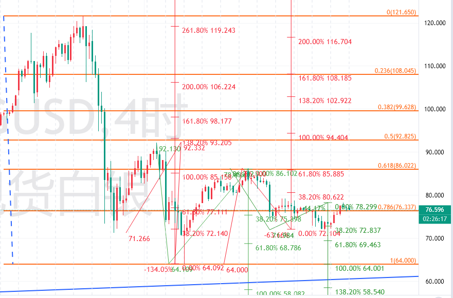 白银行情,昨天比黄金强势,破了76-77阻力。依然是扫荡走势,接下来79-80区域重点,进一步依然85-86美元,关注冲高回落。下方支撑明显,70-71依然是重点,短期关注75美元区域。操作上,依然跟随黄金的步伐,带好止损!