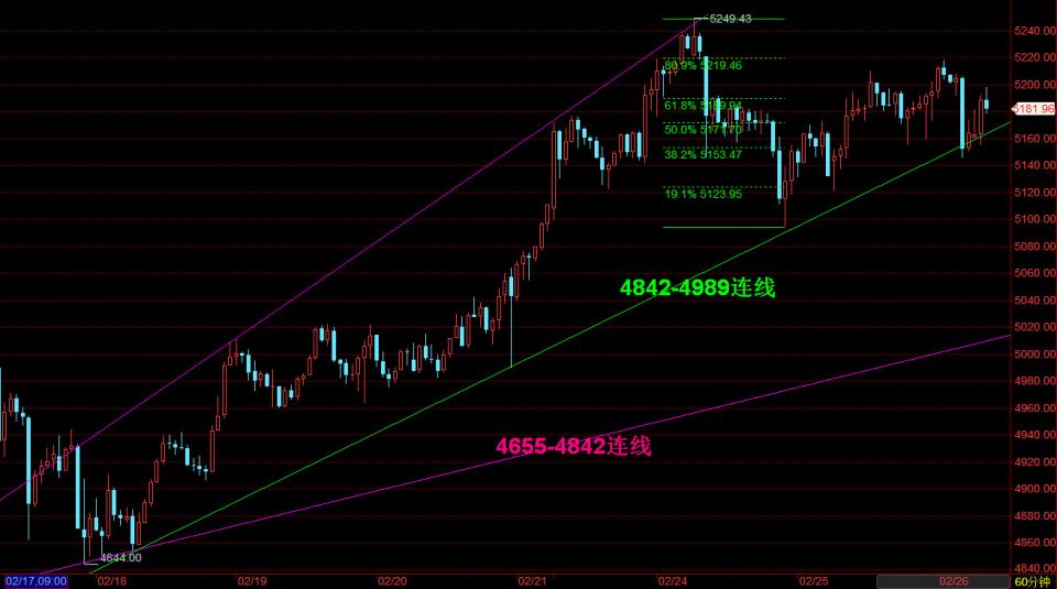 后面我们就来看一下后续进一步可能的走势,由于昨天的相对高位区间折腾扑腾出两个高点,那5145不破就还是强势,上方的话,中间5200承压,进一步5220承压回落,如果突破5220的话,再考虑5250压力。下方的话测试5145不破做多,5145不破低多,如果跌破5145的话,说明5155跌破确认,4842-4898的连线跌破确认,那样就还要去挑战5120支撑和5094支撑,以这两个点为风控做多。今天是一个过渡日,可能不太好做,看行情如何发展吧。