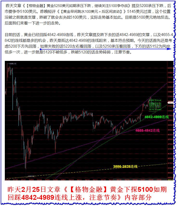昨日黄金开盘5143美元,最高5217.70美元,最低5120.50美元,收盘5164.35美元,报收小阳线,相对于最近的波动频率和幅度而言,昨天可谓是小区间震荡。昨天文章《【格物金融】黄金下探5100如期回踩4842-4989连线上涨,注意节奏》提及5152风控看上涨,然后5220左右看回落。最终黄金的实际走势是5155附近上涨到5217.70美元下跌5145美元,基本在昨日文章的框架内。