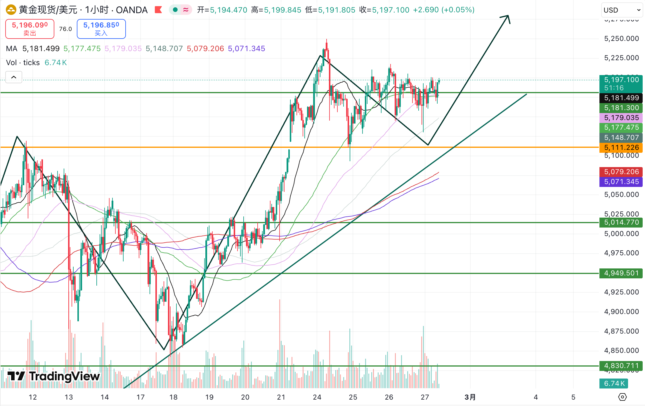 前天我们重点提醒的“假突破”,在昨天(26 日)如期兑现。金价低点精准落在 1小时 MA120(约 5130)附近,随后于隔夜美盘尾段强势反弹,重新收复 5181 关键关口。