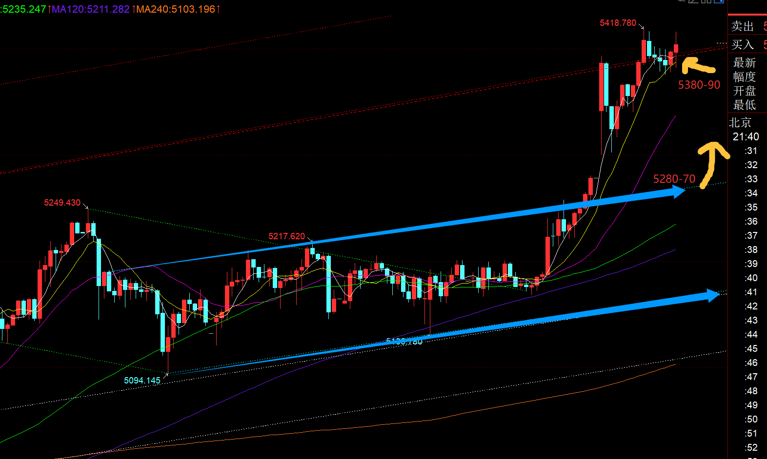 从小时线级别看,今日早间高开直接抵达5380符合周视频预期,而原本推演是承压5380回落给到5280再继续北上,可惜日内两次都只给到5305, 低位踏不上,一直处于看戏中,白天也太多时间去持续盯盘,午后14点前后5340这里其实是存在顶底支撑的;当前来看,短周期macd顶背离严重,高位追涨风险也大,空间有限或者容易冲高回落,留意10均线得失(当前上移5390-80),若大阴时候有效,则反弹确认承压就会向下运行一波,下方则关注5347-5340支撑,中轨和618位置,而偏强支撑还是5280-5270,靠近蓝色通道上轨确认点,下滑支撑企稳则可以继续北上;