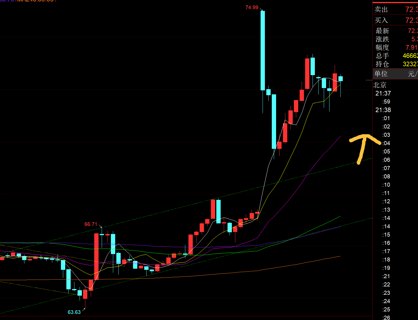 第三,原油方面:早间开盘大幅高开至75一线,随后回踩66.1-75的618分割位置69.5企稳又向上拉升一波至73.3; 从当前图看,欧盘并未破新高,那么美盘存在震荡,再下探触及69上看日内双底的企稳拉升;