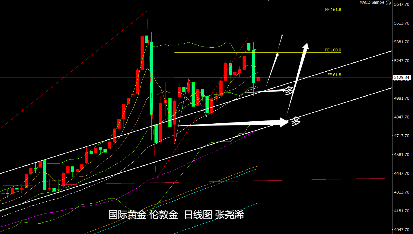日图,金价目前大幅回落触及中轨及上升趋势通道支撑位置,虽ZZ指标未显示回落触底,但也是做多看涨的机会,进一步60日均线支撑位置,也是再度布局中长线的机会。
