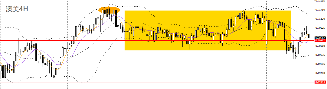 澳美昨日强势反弹,4小时重回0.7040一线阻力上方,但仍未摆脱高位震荡格局,可继续保持观望。