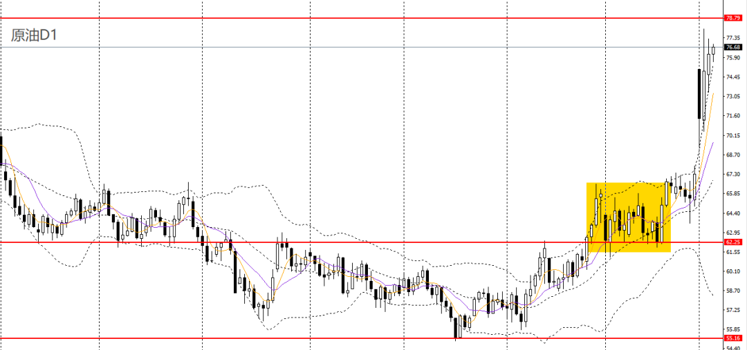 美原油昨日继续强势拉升,仍立于日线布林上轨之上,4小时再度逼近78大关,74上方可延续多头思路,如彻底站上78,可继续看多至82-83一带。