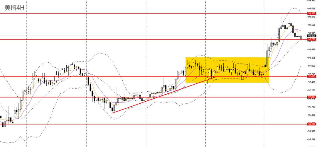 美元指数昨日收长阴柱,仍徘徊于日线布林上轨附近,4小时多次回踩98.70附近支撑,如继续站稳上方,短线有望维持偏强走势。