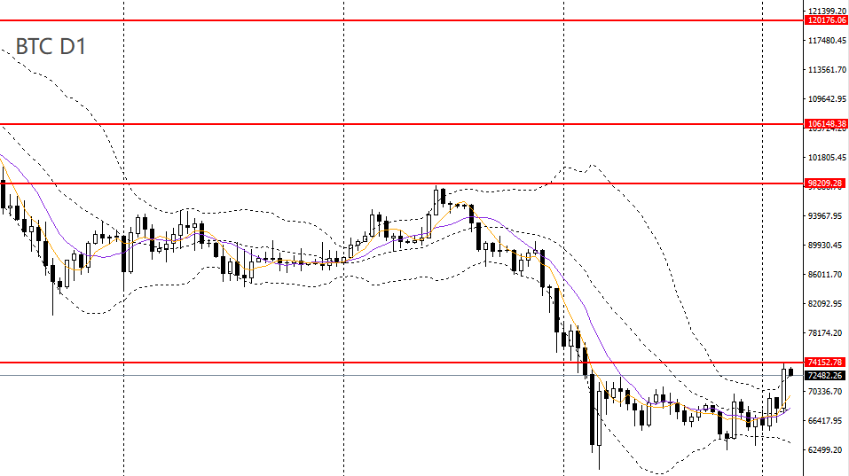 比特币日线呈多方炮,上破布林上轨,4小时一举升破70000关口,打破此前区间震荡格局,短线趋势转强,上方重点关注74000附近阻力。