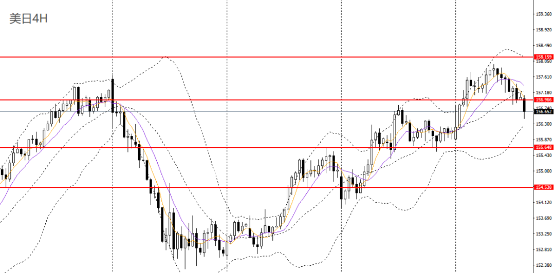 美日昨日小幅收跌,失守5日均线,日线RSI跌至50左右,4小时下破157附近支撑,呈头肩顶,157关口一带承压可进空。