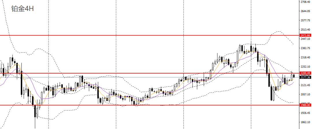 铂金收流星阳线,日线RSI回升,4小时刺破2200关口阻力,如进一步升破,短线有望上探2250附近。